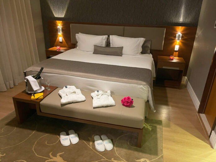 Paralelamente, mais de R$ 4 milhões foram dedicados à renovação dos quartos. Foram trocados mais de 900 colchões e boxes, instalados novos blackout, cortinas e trilhos, enxovais completos, dispensers nos banheiros, chaleiras elétricas em categoria Prime, cafeteiras em várias suítes, além de tábua e ferro de passar. O resultado é um ambiente onde conforto e praticidade caminham lado a lado.